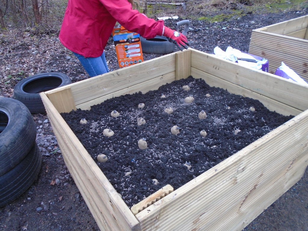 There have been workshops held with adult volunteers at Finding Your Feet Community Garden. Three large planters were filled with peat-free compost and seed potatoes.